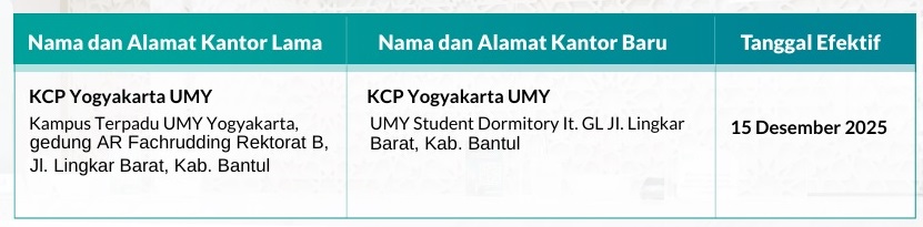 Relokasi dilakukan dari KCP Yogyakarta UMY lama yang beralamat di UMY Student Dormitory lt. GL, Jl. Lingkar Barat, Kabupaten Bantul, menuju KCP Yogyakarta UMY baru yang berlokasi di Gedung AR Fachruddin Rektorat B, Kampus Terpadu UMY Yogyakarta, Jl. Lingkar Barat, Kabupaten Bantul. Pemindahan ini akan mulai berlaku efektif pada 15 Desember 2025.