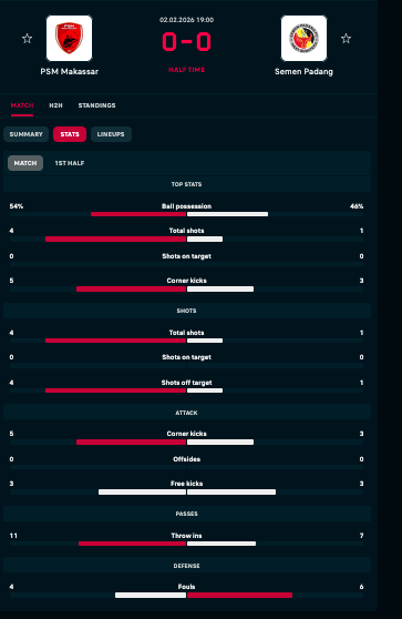 Bertindak sebagai tim tamu, Semen Padang langsung mengambil inisiatif serangan sejak peluit awal dibunyikan wasit Yudai Yamamoto. Tekanan cepat membuat PSM Makassar harus bekerja keras meredam agresivitas lawan pada menit-menit awal pertandingan.